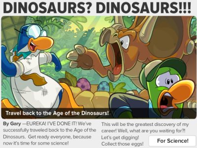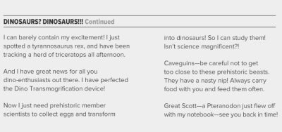 I can barely contain my excitement! I just spotted a tyrannosaurus rex, and have been tracking a herd of triceratops all afternoon. And I have great news for all you dino-enthusiasts out there. I have perfected the Dino Transmogrification device! Now I just need prehistoric member scientists to collect eggs and transform into dinosaurs! So I can study them! Isn't science magnificent?! Caveguins- be careful not to get too close to these prehistoric beasts. They have a nasty nip! Always carry food with you to feed them often. Great Scott- a Pteranodon just flew off with my notebook- see you back in time!