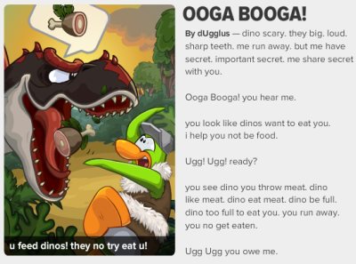 By dUgglus-dino scary. they big. loud. sharp teeth. me run away. but me have secret. important secret. me share secret with you. Ooga Booga you hear me. you look like dinos want to eat you. i help you not be food. Ugg! Ugg! ready? you see dino you throw meat. dino like meat. dino eat meat. dino be full. dino too full to eat you. you run away. you no get eaten. Ugg Ugg you owe me.